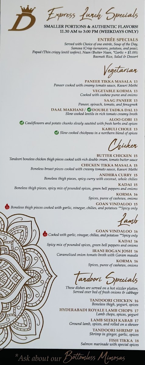 Boneless chicken pieces marinated overnight in chai, ginger, and cheese spices with spinach, tomato, and fenugreek